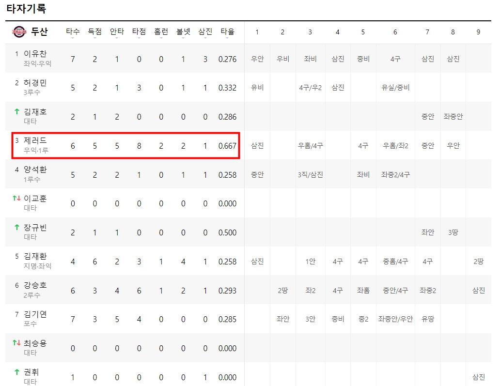 - 두산의 새로운 외국인 타자 제러드는 8회까지 6타수 5안타, 2홈런, 8타점을 기록하며, 역대 외국인 타자 한 경기 최다 타점 기록(8타점)과 동률을 이루었다. 2002년 SK의 호세 페르난데스, 2015년 NC의 에릭 테임즈과 타이기록임