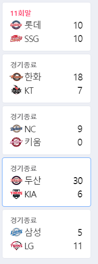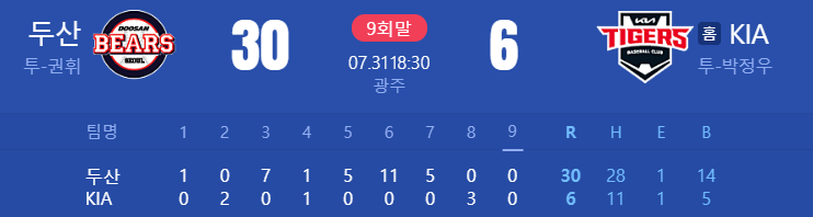 두산 베어스가 현재 1위 기아를 상대로 KBO 최초 30득점, 최다득점 신기록을 세웠습니다.