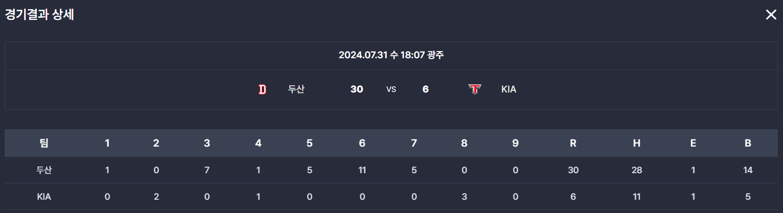 - 2024년 7월 31일 기아 챔피언스필드에서 열린 KIA와의 원정 경기에서 7회초에 30득점을 기록 이는 두산이 처음으로 한 경기에서 30점을 달성