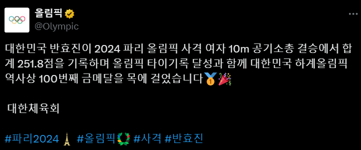 이는 1992 바르셀로나 올림픽에 출전한 여갑순 선수의 사격 종목에서 금메달을 차지한 이후 32년 만이며, 1976 몬트리올 올림픽 레슬링 양정모의 금메달 이후 대한민국 역대 100번째 금메달이기도 합니다.